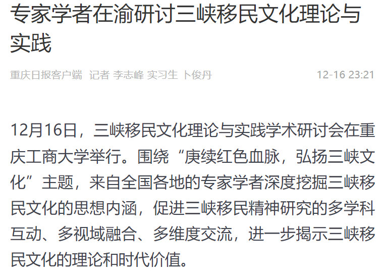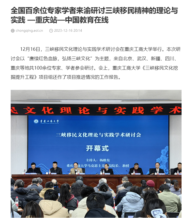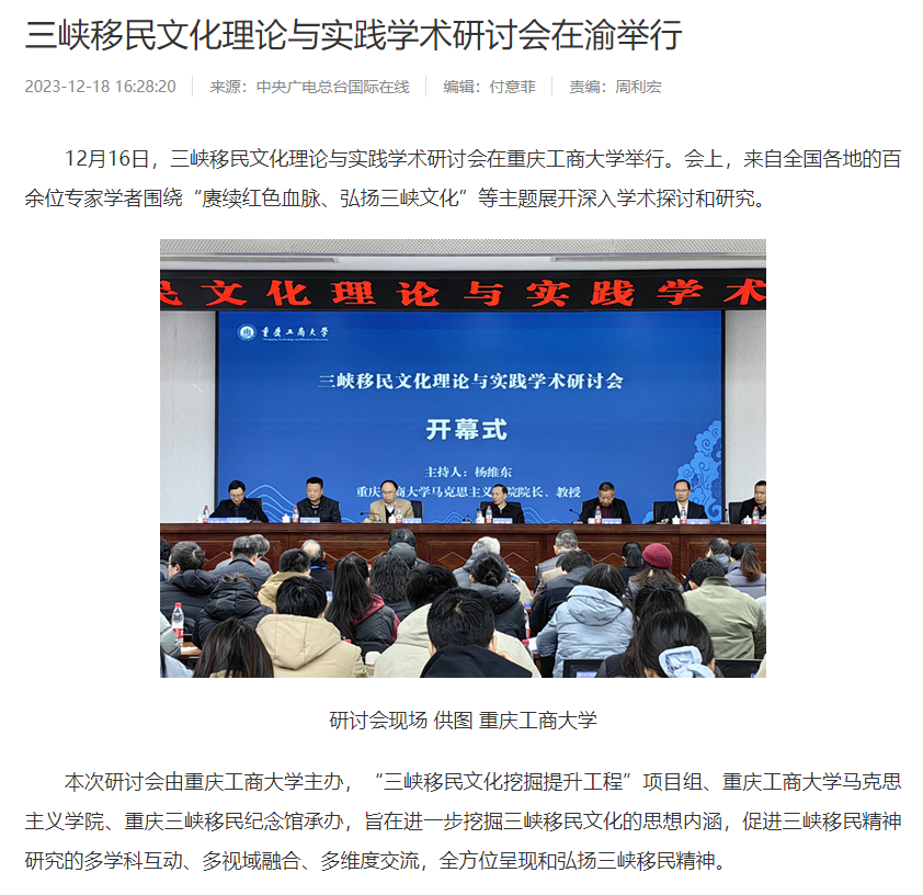 12月16日,三峡移民文化理论与实践学术研讨会在安博app官网登录_安博anbo(中国)召开,本次研讨会以“庚续红色血脉,弘扬三峡文化”为主题,由安博app官网登录_安博anbo(中国)主办,“三峡移民文化挖掘提升工程”项目组、安博app官网登录_安博anbo(中国)马克思主义学院、重庆三峡移民纪念馆承办。来自北京、武汉、四川、重庆、新疆等地共100余位领导、专家、学者参加了会议。中央广电总台国际在线、环球时报网、重庆日报客户端、华龙网、中国教育在线等多家媒体对本次论坛进行了报道。