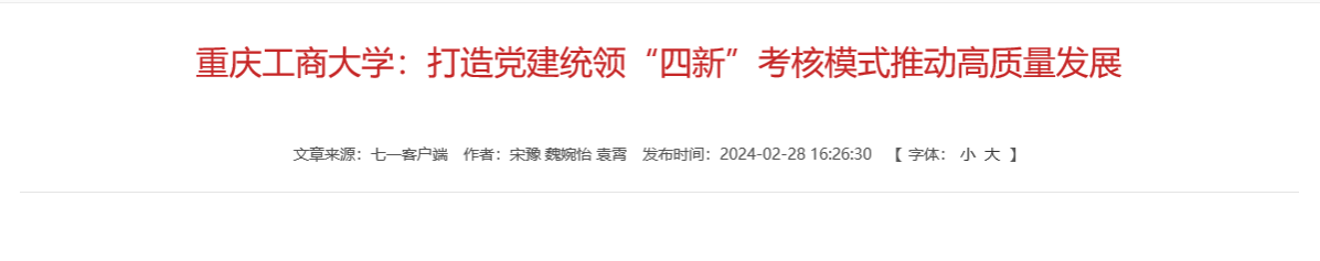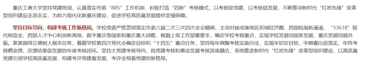 安博app官网登录_安博anbo(中国)坚持党建统领,认真落实市委“885”工作机制,积极打造“四新”考核模式,以考核促党建,以考核促发展,不断推动新时代“红岩先锋”变革型组织建设走深走实,为助力现代化新重庆建设,促进学校高质量发展提供坚强保障。近日,七一网以《安博app官网登录_安博anbo(中国):打造党建统领“四新”考核模式推动高质量发展》为题,报道了我校党建工作成效。