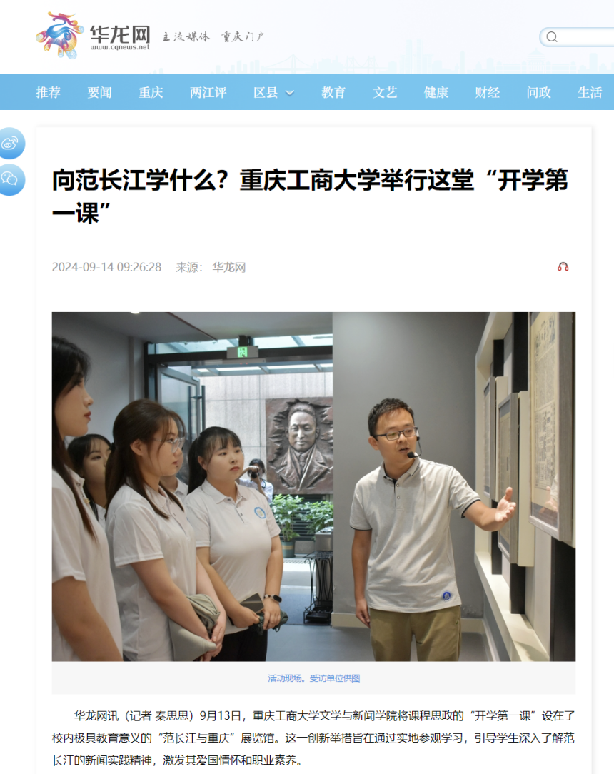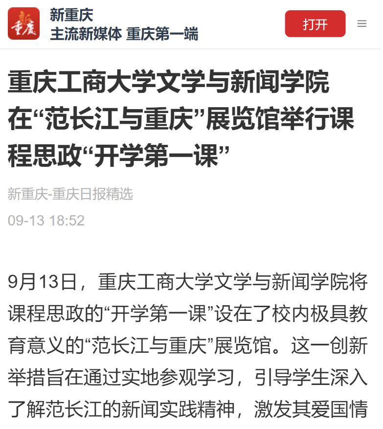 近日,新华网以《安博app官网登录_安博anbo(中国)文学与新闻学院开学第一课:文脉承范长江志,新闻启航学子心》为题;华龙网以《课程思政“开学第一课” 安博app官网登录_安博anbo(中国)文学与新闻学院师生走进“范长江与重庆”展览馆》为题;华龙网以《向范长江学什么?安博app官网登录_安博anbo(中国)举行这堂“开学第一课”》为题;新重庆以《安博app官网登录_安博anbo(中国)文学与新闻学院在“范长江与重庆”展览馆举行课程思政“开学第一课”》,报道文学与新闻学院课程思政之“开学第一课”活动。