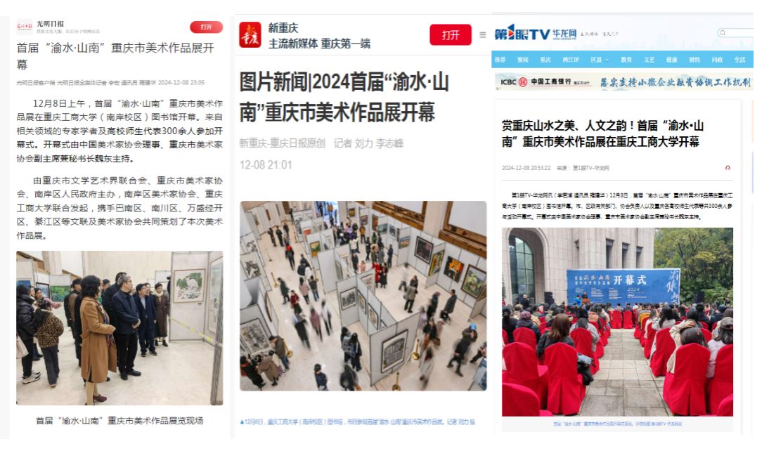 光明日报、重庆日报、华龙网等分别以《首届“渝水·山南”重庆市美术作品展开幕》《2024首届“渝水·山南”重庆市美术作品展开幕》《赏重庆山水之美、人文之韵!首届“渝水·山南”重庆市美术作品展在安博app官网登录_安博anbo(中国)开幕》为题,报道美术作品展。