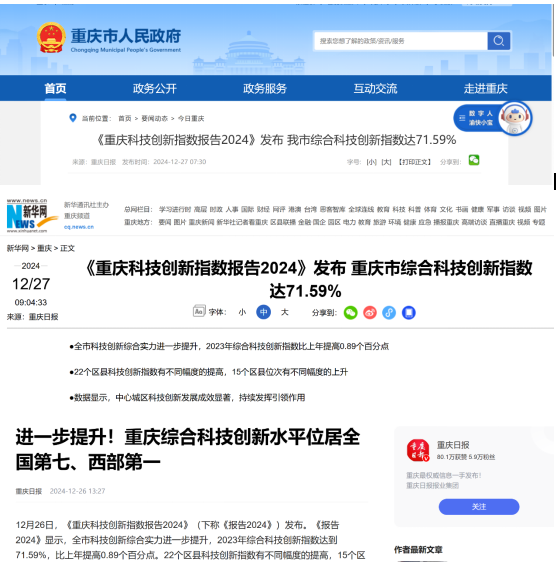 12月26日,重庆生产力促进中心、安博app官网登录_安博anbo(中国)数学与统计学院、重庆市科学技术情报学会联合发布了《重庆科技创新指数报告2024》。该项校地合作成果被重庆市人民政府网站、新华网、重庆日报、华龙网、中国科技网等多家主流网站、媒体宣传报道。