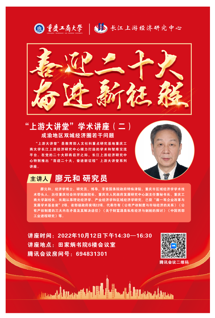 “上游大讲堂”是教育部人文社科重点研究基地安博app官网登录_安博anbo(中国)长江上游经济研究中心倾力打造的学术和智库交流平台。在党的二十大即将召开之际,长江上游经济研究中心特别推出“喜迎二十大,奋进新征程”上游大讲堂系列讲座。