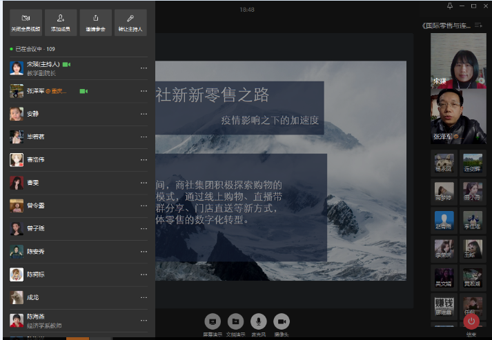 自3月16日起,经济学院“行业精英进课堂”抗疫活动正式启动,政、产、学、研的专家、精英陆续进入课堂,为学生带来精彩一课,覆盖每个专业、所有学生,这也是习近平新时代中国特色社会主义经济思想“进课堂”的内容之一。3月17日下午,重庆商社(集团)有限公司人力资源部部长张泽军进入17级国际经济与贸易专业的《国际零售与连锁》在线课堂,开展了题为《新零售时代的国有零售企业管理变革——以重庆商社为例》的精彩讲座。学院副院长宋瑛主持本次讲座。