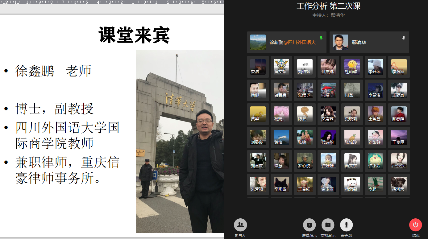 在第一周网络教学中,人力资源管理系教师积极探索引入企业人士进入网络课堂与师生互动交流,先后邀请了金科地产、海尔物流的企业高管探讨相关主题,取得良好的课堂反馈,受到了学校和学院的肯定。为进一步纵深推进在线教学工作,人力资源管理系主任郑月龙博士与人力资源管理专业冉景亮博士、鄢清华老师等进行了积极探讨,并于3月9日,以《工作分析》课程先行试水,鄢清华老师进一步探索将这种模式扩展为一种全景式网络课堂。所谓工商管理学科课程全景课堂,以往的教学模式是将具体的案例的视频、场景、角色等的呈现方式的全景化,使学生感受更真实全面。而网络教学模式下,由于课堂与外部资源的连接更为便利,可以实现课堂教学与外部的企业、专家、相关的工作人员直接对接,是另外一种意义上的全景式课堂。