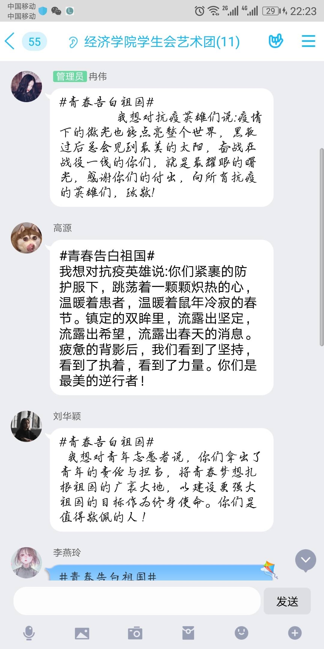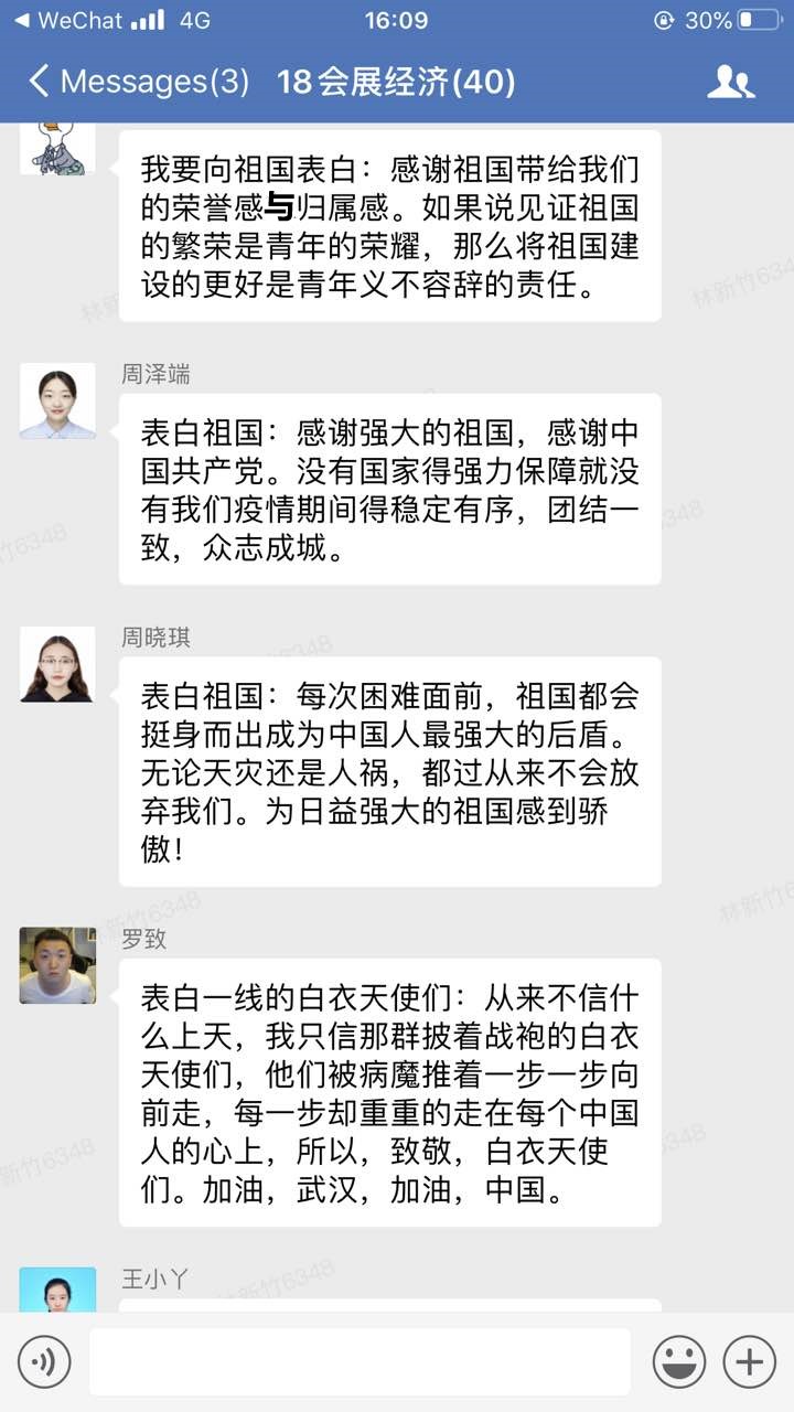 “青春告白祖国,我想对祖国说:何其有幸,生为中华儿女。天灾人祸,有你在便得安心。神州大地团结一心,愿我国早日恢复,繁荣昌盛。”在这个特殊五四青年节,大学生团员们虽然暂时不能返回校园,但激情与活力未减。经济学院分团委积极响应校团委号召,举办以“学习五四精神,青春告白祖国”为主题的活动,组织团员们学习习近平总书记五四讲话精神,并运用企业微信、QQ等各种线上平台的交流群,组织团员们以青春之我,告白祖国、告白共青团、告白奋斗中的广大中国青年,字里行间都流露出团员青年最真挚的感情。