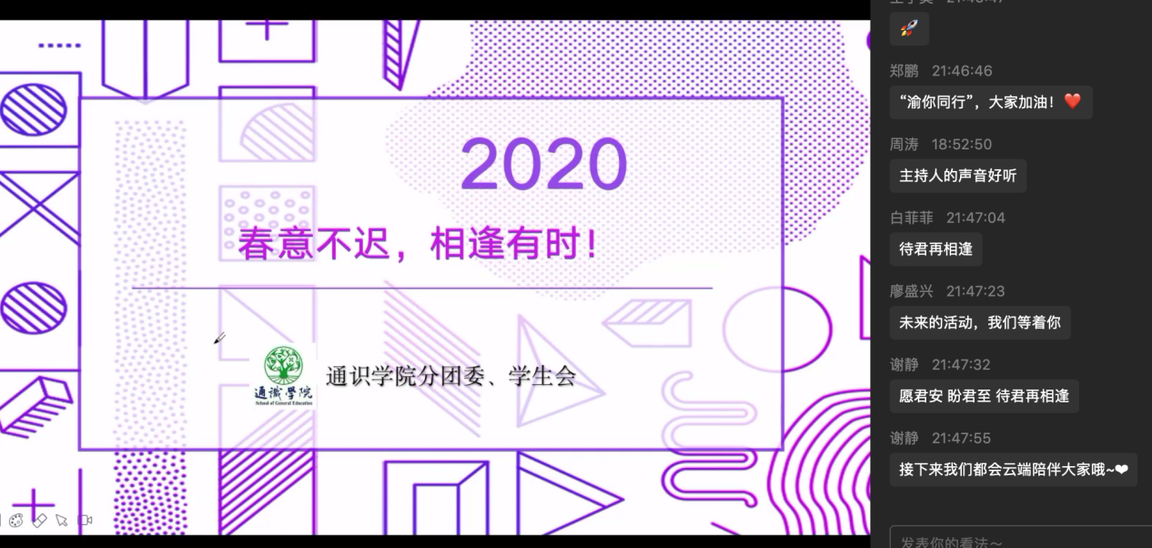 5月1日晚,通识学院“渝你同行”欢迎湖北学生返校线上活动在企业微信平台以直播形式顺利举行。学院领导、全体辅导员老师和47名返校学生一起参与了活动。