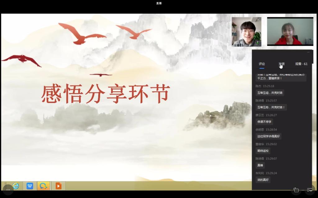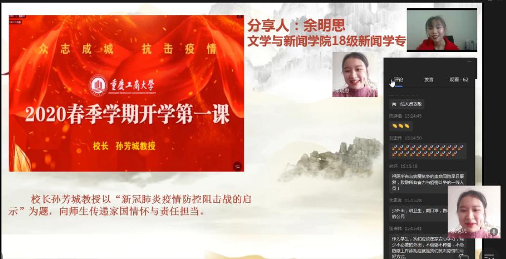 随后,大家还一起分享了《孙芳城校长2020春季学期开学第一课》的学习感悟。余明思同学说:孙校长以‘新冠肺炎疫情防控狙击战的启示’为题,从疫情进展及成效,启示和体会、我们的责任与担当等三个方面,给我们上了一堂跨越空间的云端课。张涛同学提到,进入直播间,网络升旗数万名重工商大师生同做升旗手、护旗手,当国歌响起的瞬间,我既感动又自豪。董俊华同学提到,这一堂特别的开学第一课,让我感触良多,校长教育我们要感恩党、感恩国家、感恩社会,在这场抗击新冠肺炎疫情的战斗中,我深刻体会到中国特色社会主义制度的优越性,认识到中国共产党的领导是“定海神针”,体会到了青年人应该有的家国情怀与责任担当。