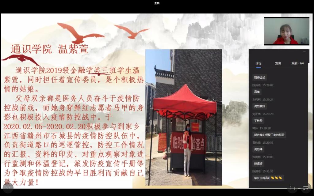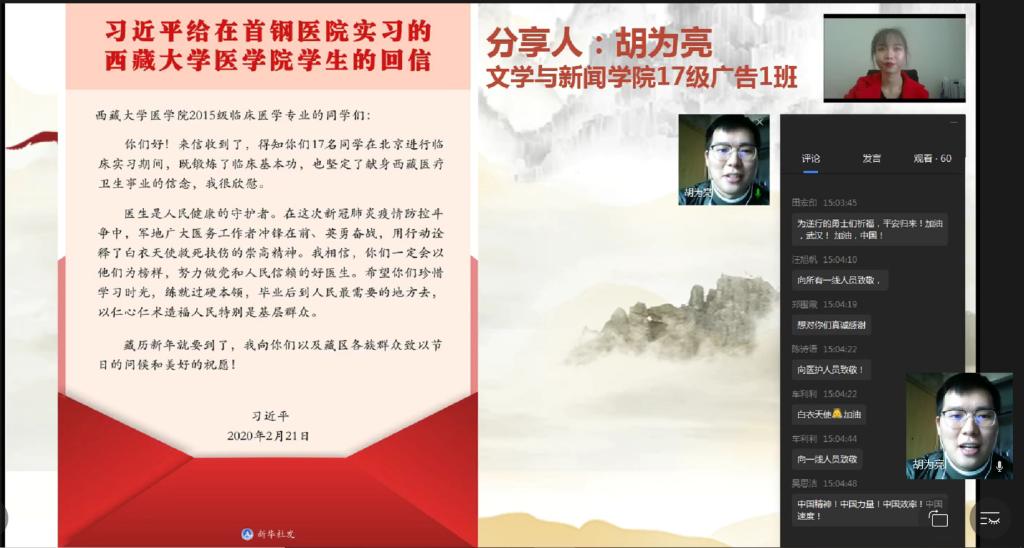 第一位分享人胡为亮同学带领大家一起阅读《习近平给在首钢医院实习的西藏大学医学院学生的回信》。大家在互动区积极发言:习近平总书记的回信情真意切、催人奋进,既体现了对西藏青年的关心和爱护,也是对全国青年学生的激励和嘱托,给予了大家前进的动力。奋斗在一线的医务工作者无论在身体上还是精神上都是最辛苦的,他们是逆行者,是战士,是英雄,大家的心始终同湖北人民、武汉人民在一起。封雨同学说,在总书记的回信中,印象最深刻的是“希望你们珍惜学习时光,练就过硬本领,毕业后到人民最需要的地方去,以仁心仁术造福人民特别是基层群众。”我们虽然不是医学生,但为国家做贡献都是一样的,现在一定要学习好专业知识,把本事练到家,待到大学毕业,也一定要去到祖国最需要的地方和岗位,把自己的前途命运和祖国的发展紧紧联系在一起,为实现中华民族伟大复兴的中国梦不懈奋斗。