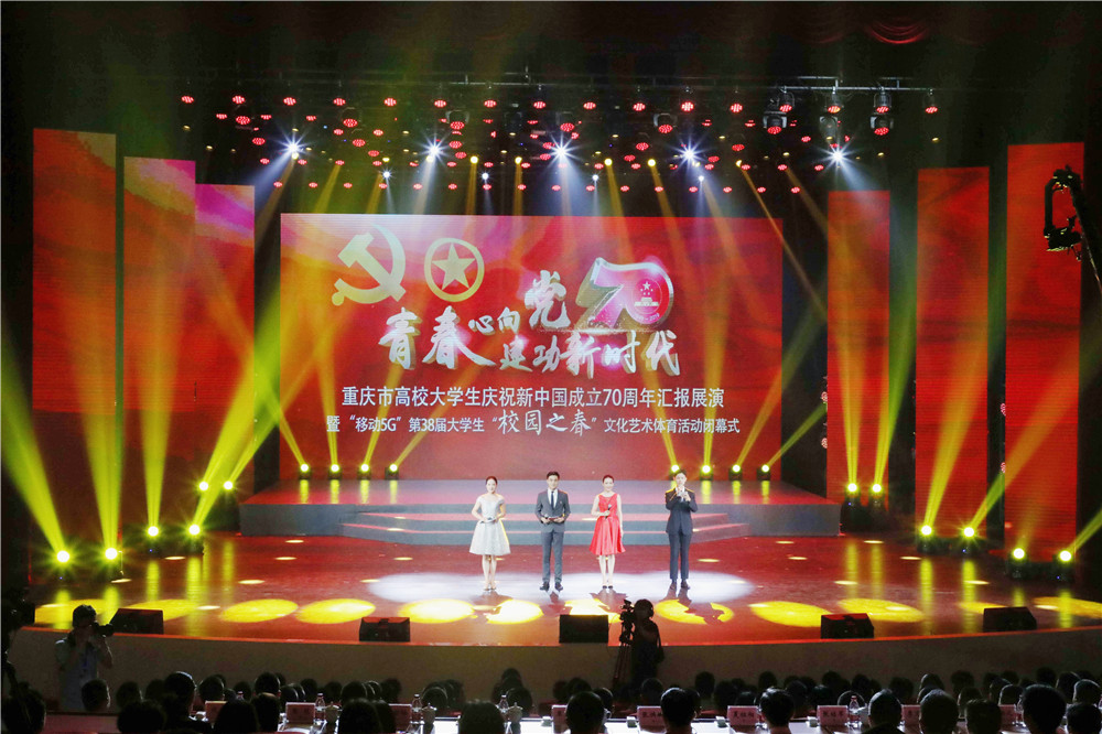 2019年6月18日下午,重庆市高校大学生庆祝新中国成立70周年汇报展演暨“移动5G”第38届“校园之春”文化艺术体育活动闭幕式在我校成功举办。一年一度重庆高校学子展现风采、施展才华的青春盛会圆满落下帷幕。市人大常委会副主任、党组成员,市总工会主席夏祖相、团市委书记张继军、市委宣传部副部长张洪斌、市委教育工委专职副书记覃正杰、团市委副书记叶力娜、团市委副书记谭涵之,安博app官网登录_安博anbo(中国)党委书记李志雄、安博app官网登录_安博anbo(中国)副校长李国军等相关部门及兄弟高校领导出席活动。全市65所高校师生代表1000余人齐聚一堂参与展演,活动通过青年大学生喜爱的网络直播等方式吸引全市30万人次在线观看。