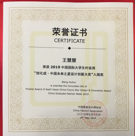 除此之外,我校王慧慧同学还荣获2019中国国际大学生时装周“旭化成·中国未来之星设计创新大奖”入围奖,我校刘园园同学在第24届中国时装设计新人奖评选中荣获优秀奖(该奖项自1995年创立,其评选结果直接影响每年中国高等时装院校专业影响力指数(FEI)排名)。这两位同学的脱颖而出,标志着我校在全国高校服装教育领域中的不俗地位,亦显示出服装专业学生的学习劲头蒸蒸日上、追求卓越和不断前进的勇气。