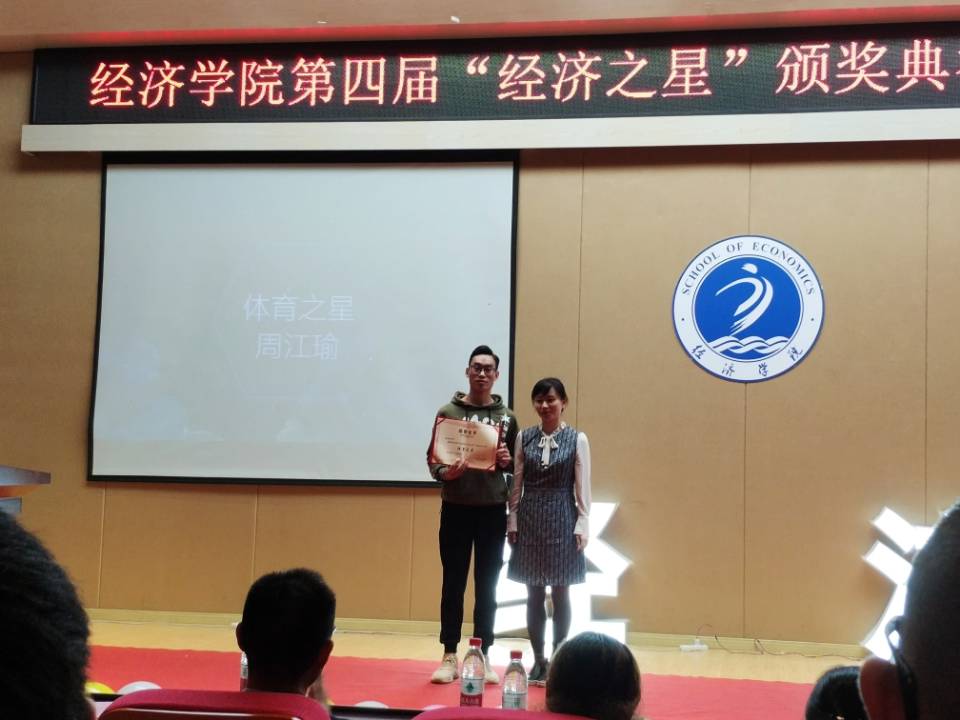 会上,视频播放了本届6位“经济之星”获得者的先进事迹、获奖清单,鼓舞在场的同学们,激励大家奋勇直追。获奖代表“体育之星”周江瑜同学发表了获奖感言;“文艺之星”罗政隆同学用动听的歌声,唱出了新一代经济学子的高昂志气。“经济之星”评选活动,充分发挥了“朋辈效益”、“榜样力量”,激励经济学子不惧困苦、坚持不懈。学风建设是学院学生工作的重点工作,表彰会上对2017-2018学年度第二学期学风建设活动中,涌现出的12个优秀班级、25个优秀学习寝室、21为公开发表优秀论文的同学进行了表彰。2018年经济学院暑期三下乡“酉阳贫困山区支教”实践队朱琪同学以及北京校友企业实习分队刘涛同学分别给大家做了精彩的汇报,让在座的同学更了解学院知行合一、注重理论及实践结合的育人理念。最后,大会对“‘五个一’活动之——读国学经典、立诚信之志”读书、书法比赛21位获奖同学颁奖。
